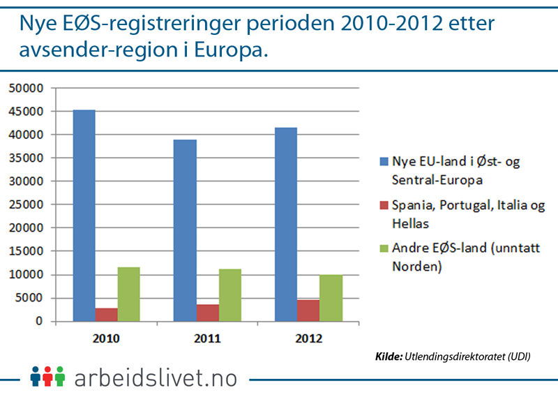 Selv om antallet registrerte borgere fra enkeltland økte sterkt i Norge fra 2010 til 2012, utgjør disse fremdeles en relativt liten andel av alle arbeidsinnvandrerne i Norge (se figurer).