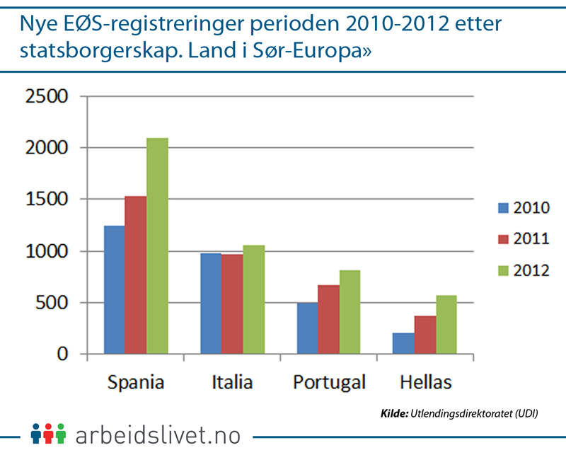 | NYE EØS-REGISTRERINGER perioden 2010-2012 etter statsborgerskap. Land i Sør-Europa.(klikk for full størrelse) |
