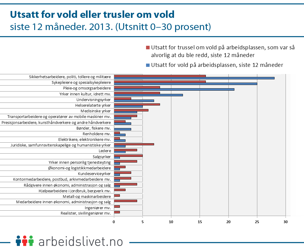 Levekårsundersøkelsene fra Statistisk sentralbyrå (SSB) har over tid undersøkt forekomsten av vold og trusler i norsk arbeidsliv. I 2013 oppga 5 prosent av arbeidstakerne at de har blitt utsatt for vold på arbeidsplassen de siste tolv månedene, mens 4 prosent har blitt utsatt for trusler om vold. Dette var omtrent det samme som i 2009.