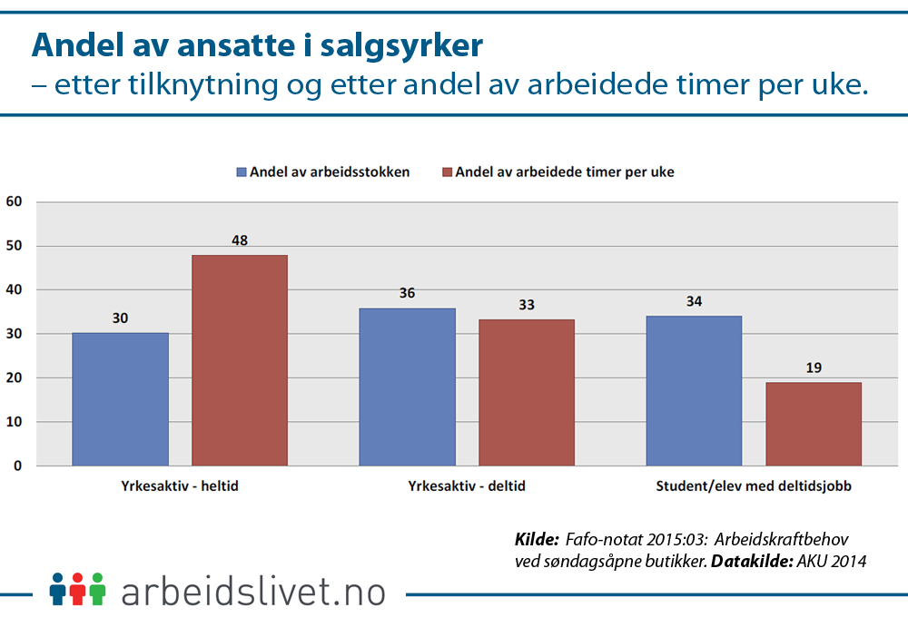 Selv om en tredjedel av de ansatte innen detaljhandel er studenter (34 prosent) står de imidlertid kun for en femtedel av arbeidstimene (19 prosent). Heltidsansatte står på sin side for nær halvparten av arbeidstimene.
