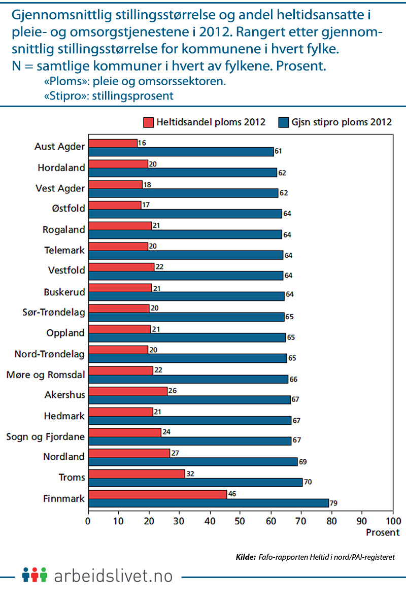 65 kommuner hadde i 2012 hadde en gjennomsnittlig stillingsprosent som oversteg 80 prosent. Av disse var femten finnmarkskommuner. Ser man kun på pleie- og omsorgssektoren, er det kun ni kommuner som kommer gjennom nåløyet, med mer enn 80 prosent heltidsstillinger (syv ligger i Finnmark).