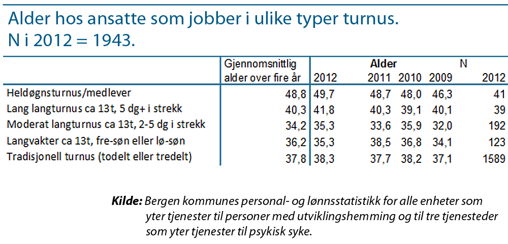 Statistikken viser da også at de ansatte i heldøgnturnus og lange langvakter er eldre enn gjennomsnittet for kollegene som går i tradisjonell turnus.