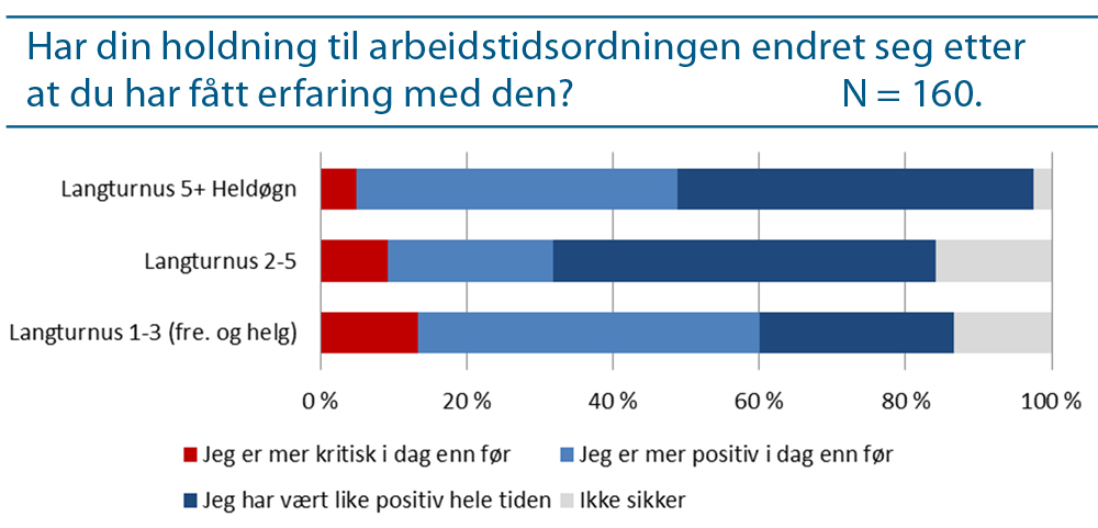 På spørsmål om holdningene til informantene har endret seg underveis i forsøket svarer de med de to mest komprimerte turnustypene i størst grad at de enten er mer fornøyde etter at forsøket startet opp, eller har vært like fornøyde hele tiden.