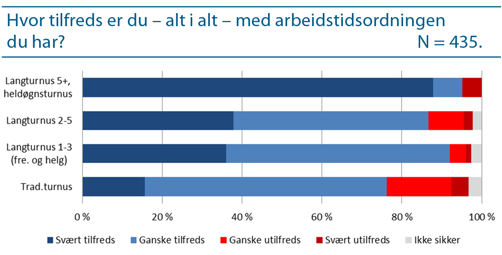 De aller fleste ansatte, uansett turnus, er fornøyde med arbeidstiden. De to mest komprimerte turnusvariantene (langturnus med flere enn fem dager i strekk og heldøgnturnus) er imidlertid omgitt av mest entusiasme. Her svarer ni av ti «svært tilfreds».