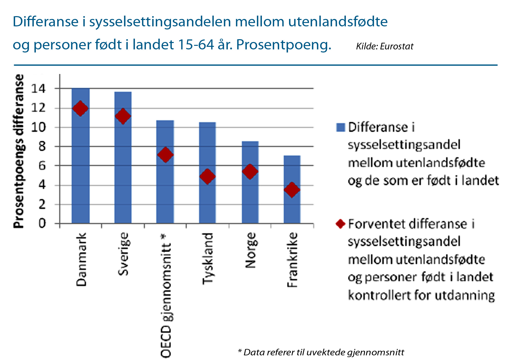 Både innenfor utdanning og arbeidsliv er innvandrere relativt godt integrerte. Skillet i sysselsetting mellom majoritet og minoritet er større i Sverige og Danmark, men betydelig mindre i Frankrike.