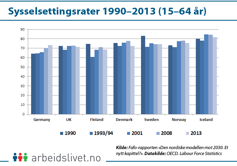 For Norden har andelen av befolkningen i arbeidsdyktig alder som faktisk er i arbeid sunket fra 78 prosent i 1990, via et bunnpunkt  på 70 prosent i 1993, til 73,7 prosent i 2013, ifølge Nordmod-rapporten.