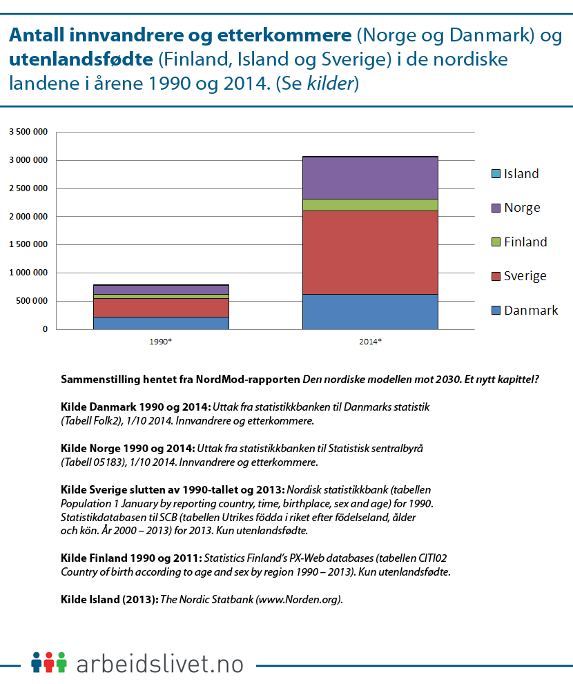| ANTALL INNVANDRERE og etterkommere (Norge og Danmark) og utenlandsfødte (Finland, Island og Sverige) i de nordiske landene i årene 1990 og 2014, som presentert i NordMods sluttrapport (klikk for full størrelse og kilder) |