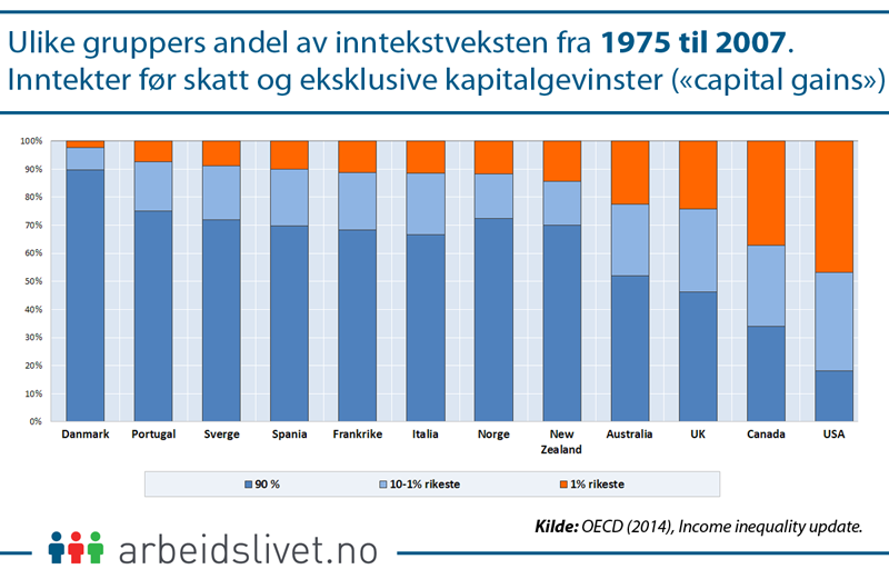 Men det finnes tegn på fare i Norden. I Norge raket 1 prosent av befolkningen til seg en større andel av den totale inntektsveksten enn sine motparter i Danmark, Portugal, Sverige og Italia.