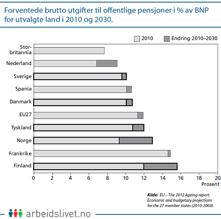 I tillegg vil pensjonsutgiftene øke. For Finland og Norge vil dette spranget bli på 3,6 prosentpoeng av BNP. For Sverige og Danmarks del er denne veksten langt mindre, rundt 0,5 prosentpoeng.