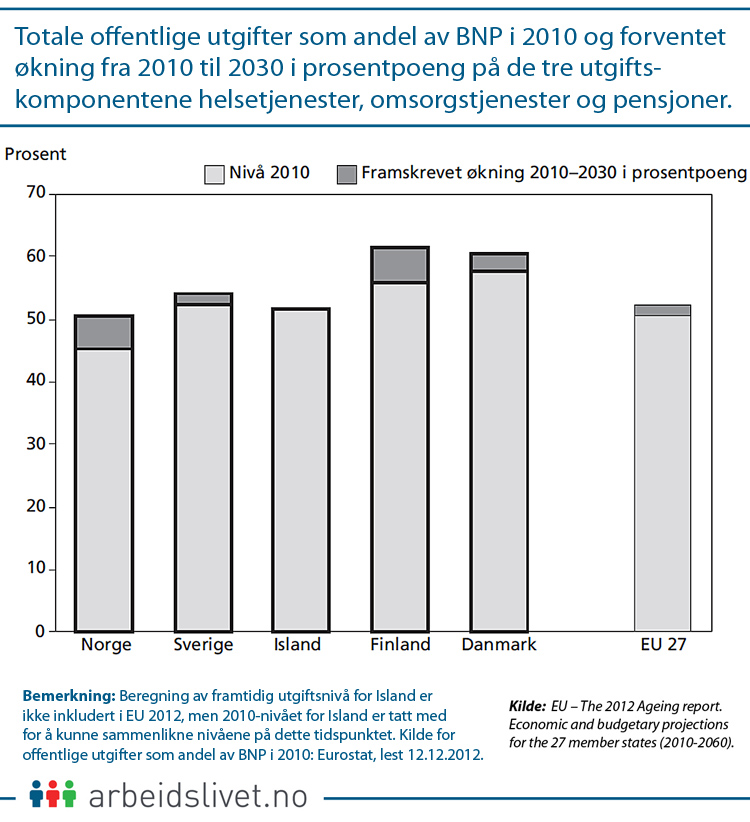 Eldreomsorg og pensjonsutgifter ligger an til å kreve mer plass i de nordiske landenes statsbudsjetter. For EU-gjennomsnittet forventer man at prisen for langtidsomsorg vil øke med 0,5 prosentpoeng av bruttonasjonalprodukt (BNP) fram mot 2030.