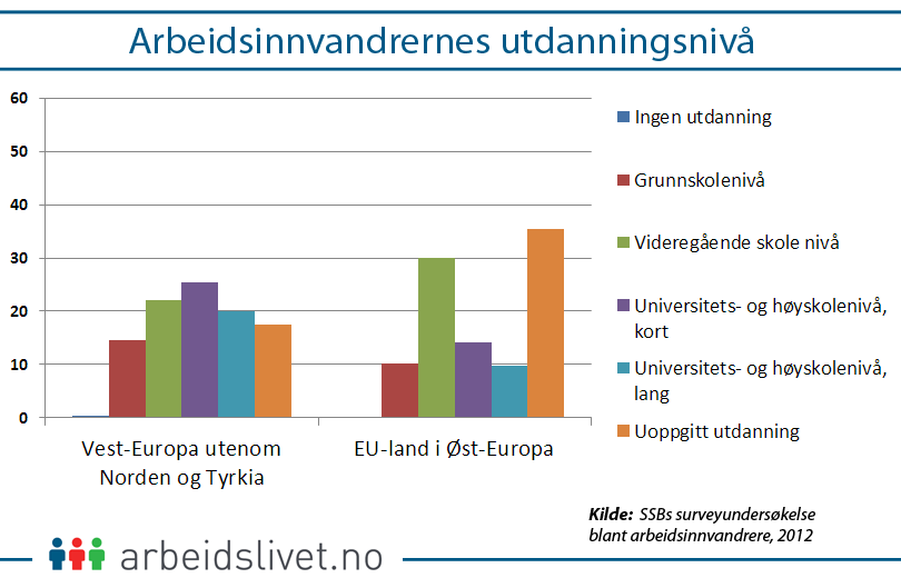 | UTDANNINGSNIVÅ blant arbeidsinnvandrere fra Øst- og Vest-Europa, 2012. (klikk for full størrelse) |
