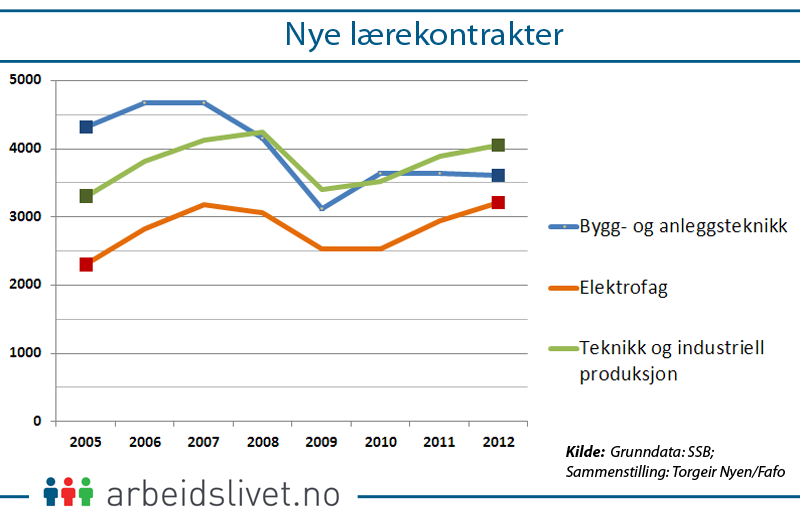 | NYE LÆREKONTRAKTER innen bygg- og anleggsteknikk, teknikk og industriell produksjon og elektrofag 2005–12. (klikk for full størrelse) |