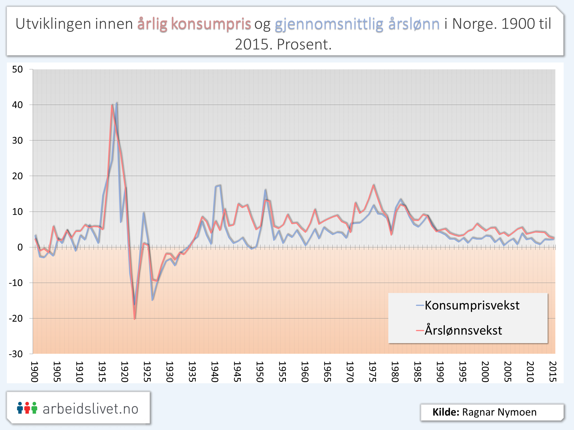 Den første figuren viser hvordan lønn og priser har utviklet seg helt siden 1900. Som du vil se, kan de svinge voldsomt. Særlig krig og økonomiske kriser vil forklare mange av de største utslagene.
