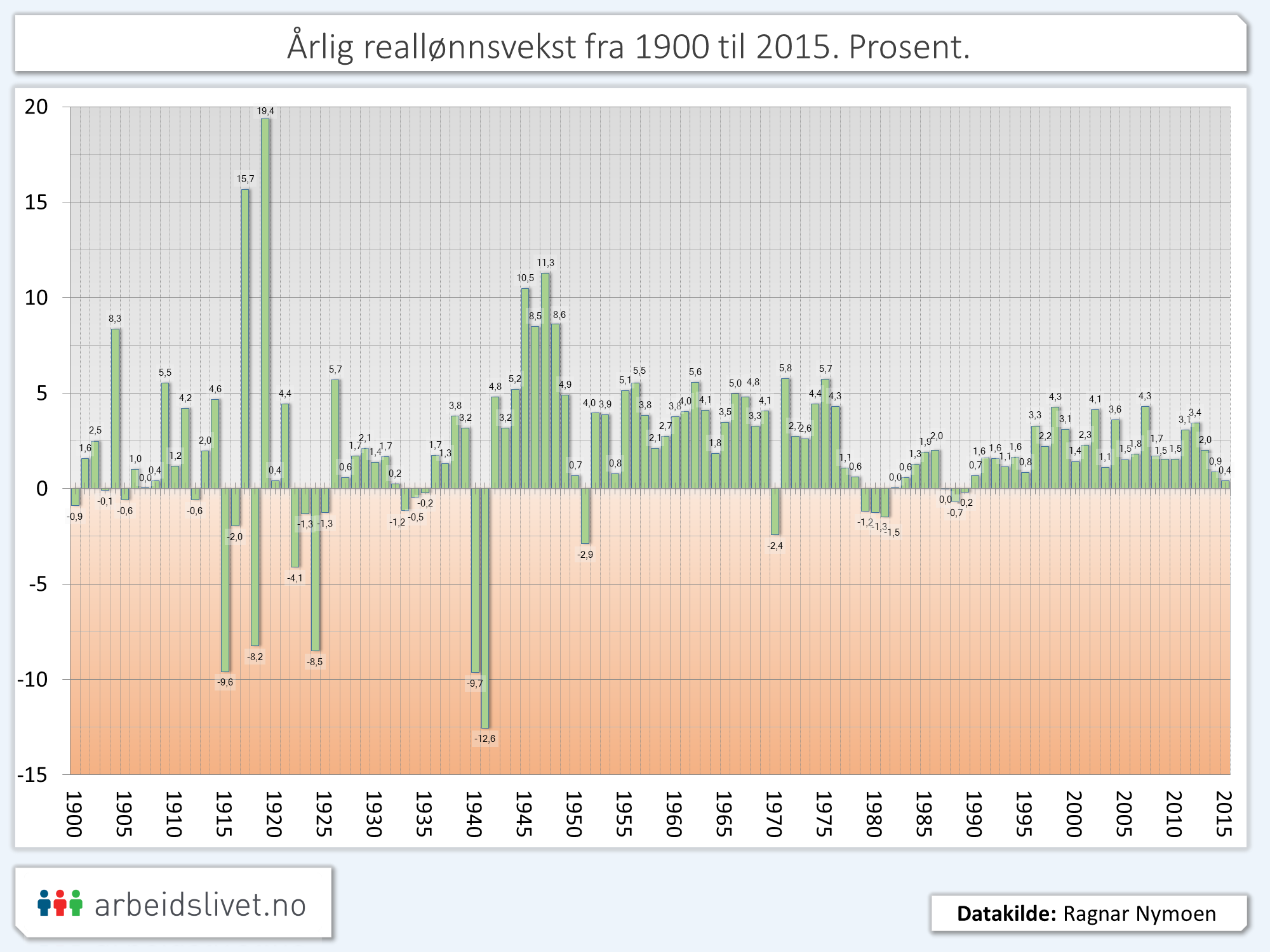 Merk at alle de tre figurene viser årlig prosentvis vekst – endring fra ett år til et annet. Skulle man vist den totale reallønnsveksten fra året 1900 til året 2015 (såkalt kumulativ vekst) vil kurvene raskt ha gått i taket. Her vil derimot for eksempel året 2015 vise prosentvis endring fra året 2014 – og så videre.