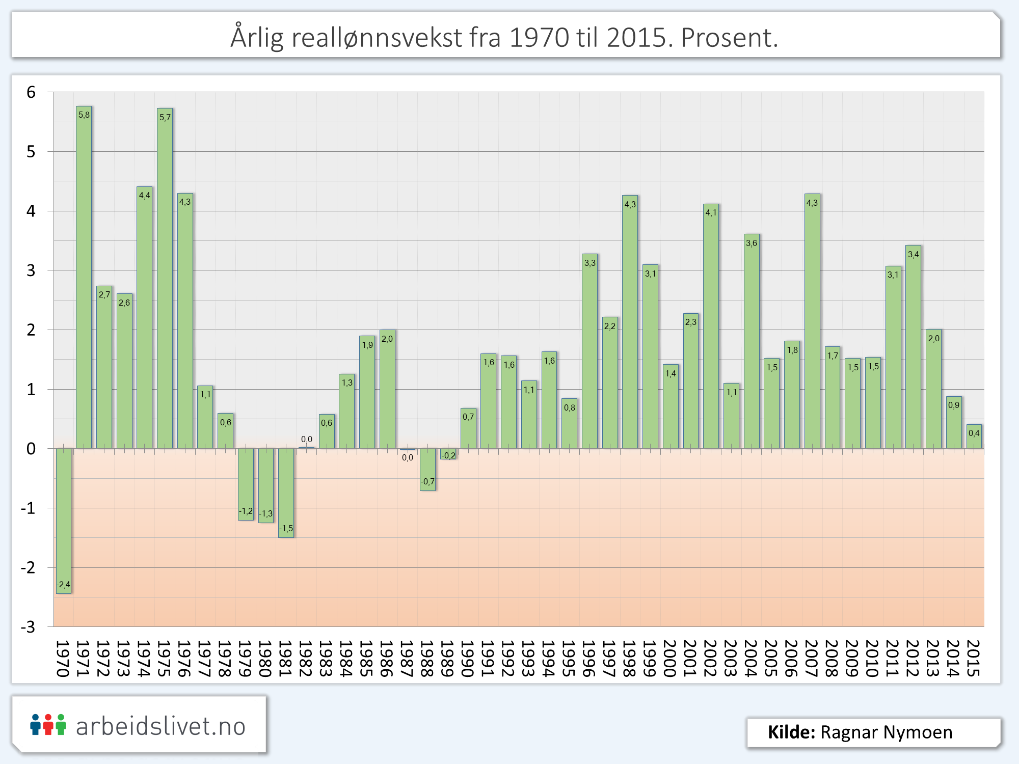 Ser vi på etterkrigstiden, var særlig 60- og 70-tallet preget av en relativt jevn vekst, etterfulgt av et urolig og «svakt» 80-tall. Gjennomsnittsnordmannen har derimot ikke opplevd et eneste år med reallønnsnedgang fra og med 1990. Her er like fullt veksten lavere enn foregående «gode» tiår. Pilen peker da også nedover: Oljekrise-året 2015 ender bare så vidt over 0.