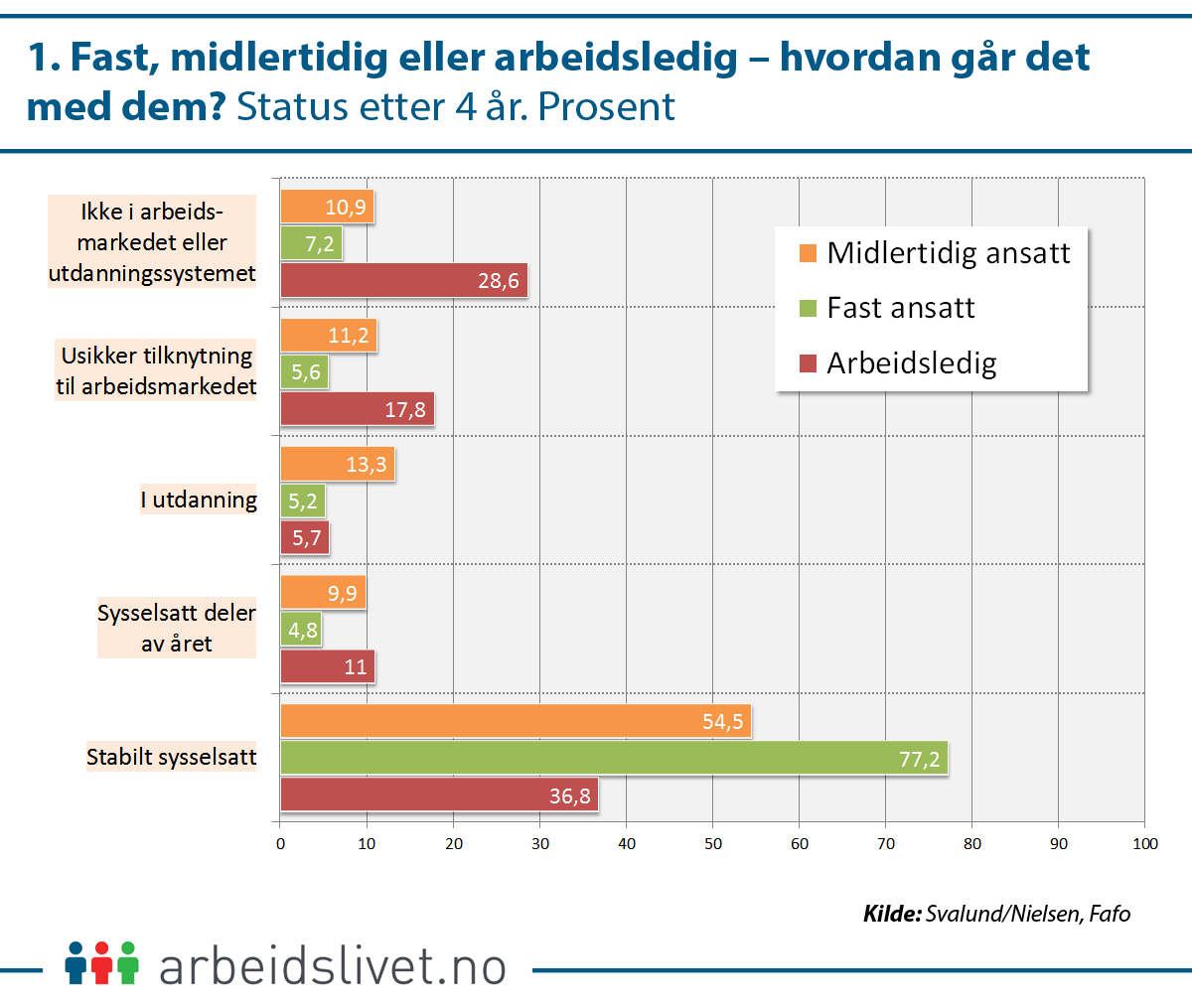 For alle som jobbet midlertidig ville i løpet av fire år litt over halvparten (55 prosent) være stabilt sysselsatt, mens en tredjedel har en ustabil tilknytting, jobber deler av året eller er verken i arbeid eller under utdanning.