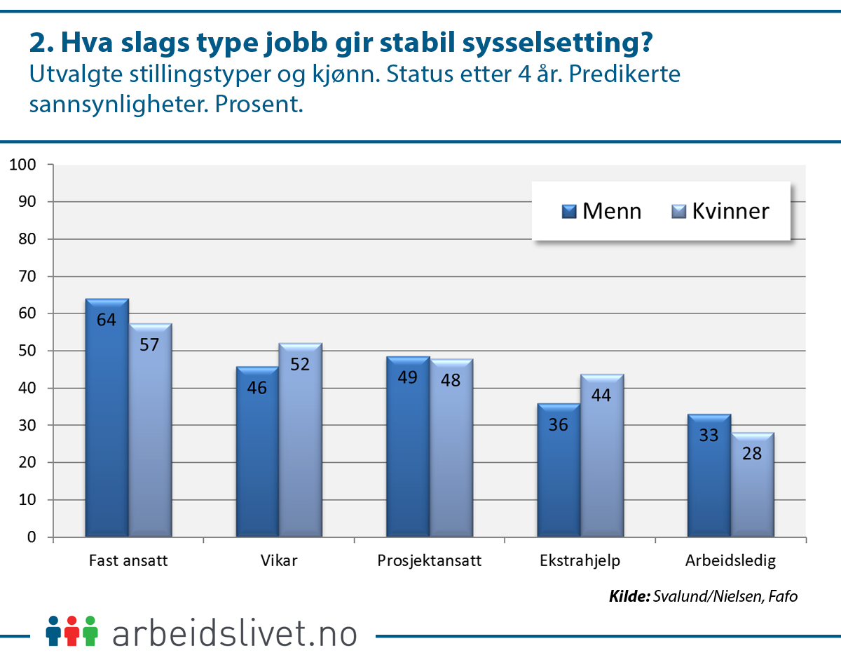 Her kommer det fram at hvem du er – kjønn, alder og utdanning – vil ha en betydelig påvirkning på om midlertidige stillinger på sikt styrker stillingen din på arbeidsmarkedet eller ei.