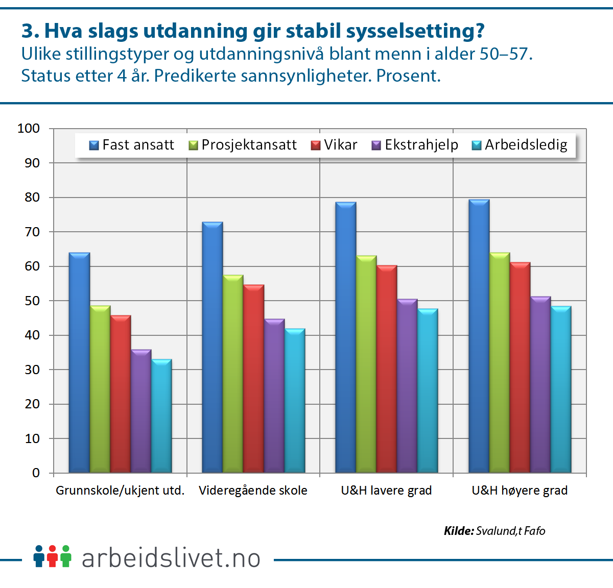 Med andre ord: Jo mindre utdanning, dess større sjanse for at man helt eller delvis faller ut av arbeidsmarkedet. Relativt sett forsterkes dette problemet i de løseste formene for midlertidige jobber.