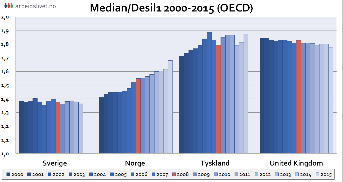 I samme periode har lønnsforskjellen mellom lavest lønnede og de midtlønnede ligget stabil på noe under 1,4 i Sverige.