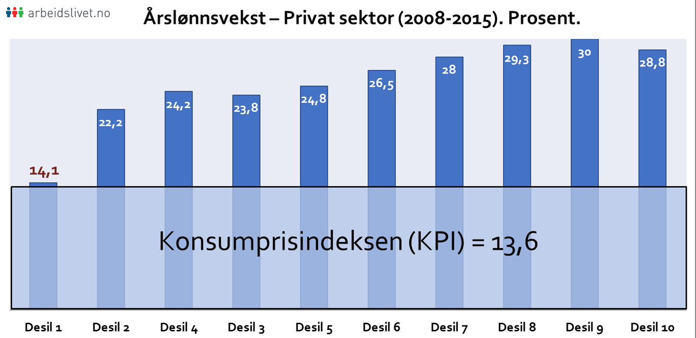 De lavest lønnede befinner seg i all hovedsak i privat sektor. For perioden 2008–2015 har de lavest lønnede her hatt en samlet årslønnslønnsvekst på 14,1 prosent. Inflasjonen har vært på 13,6 prosent, slik at reallønnsøkningen har vært på beskjedne 0,5 prosent for perioden.