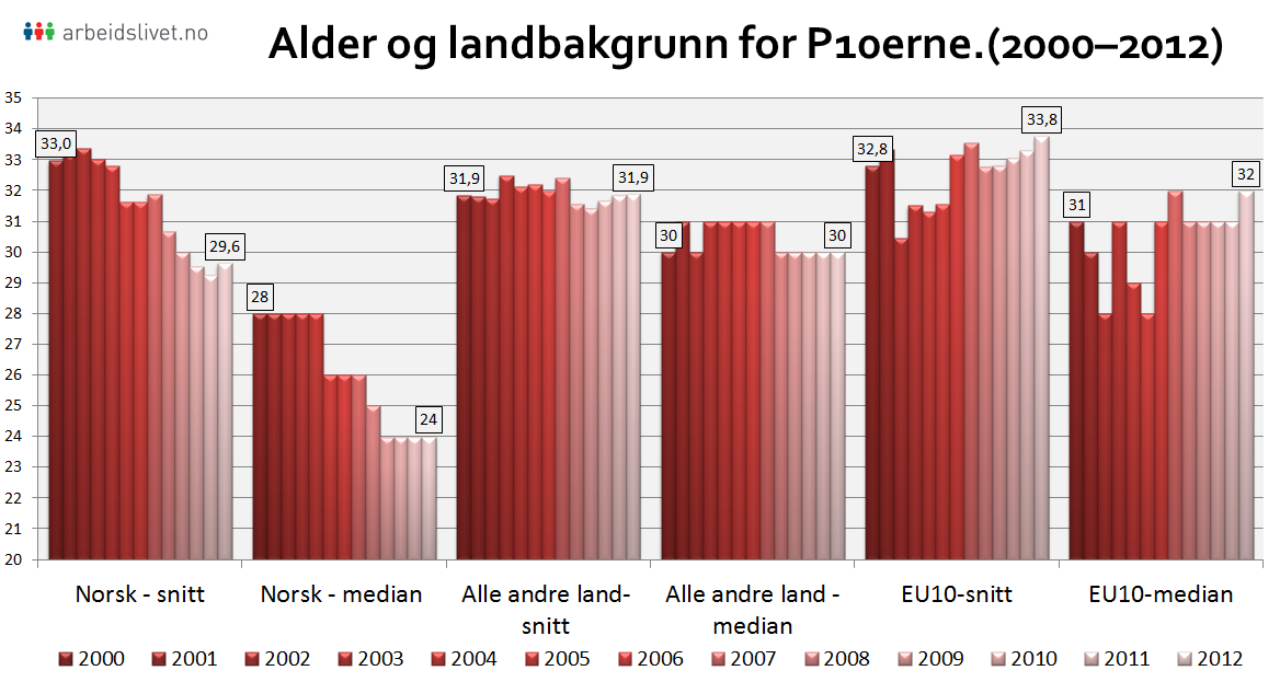 Deler man de lavest lønte inn i ulike landbakgrunner ser man at trenden med synkende snittalder ikke gjelder alle. Tvert imot: Mens den blant norskfødte falt med 3,4 år til 29,6 år, sto den på stedet hvil blant «andre land» og økte med rundt ett år blant EU-10-gruppen («EU Øst»), til 33,8 år i 2012.