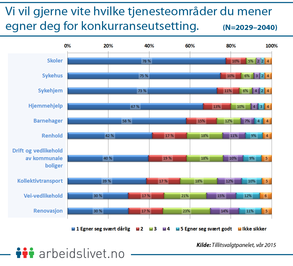 TILLITSVALGTES MENINGER: Slik svarte Tillitsvalgpanelet våren 2015 på spørsmål om hvilke tjenesteområder de mener egner seg for konkurranseutsetting. (For bedre bildekvalitet, se boks noe lenger ned i artikkelen.)