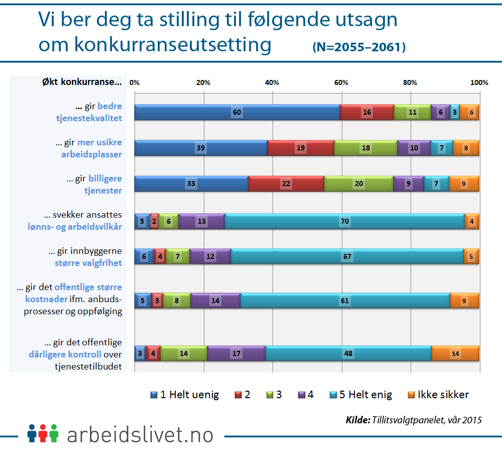Vi ba de tillitsvalgte ta stilling til følgende påstand: «Økt konkurranseutsetting gir bedre tjenestekvalitet». 60 prosent sa seg «helt uenig», og ytterligere 16 prosent var uenige i denne påstanden. Dette er omtrent de svarene som ble gitt i 2013.