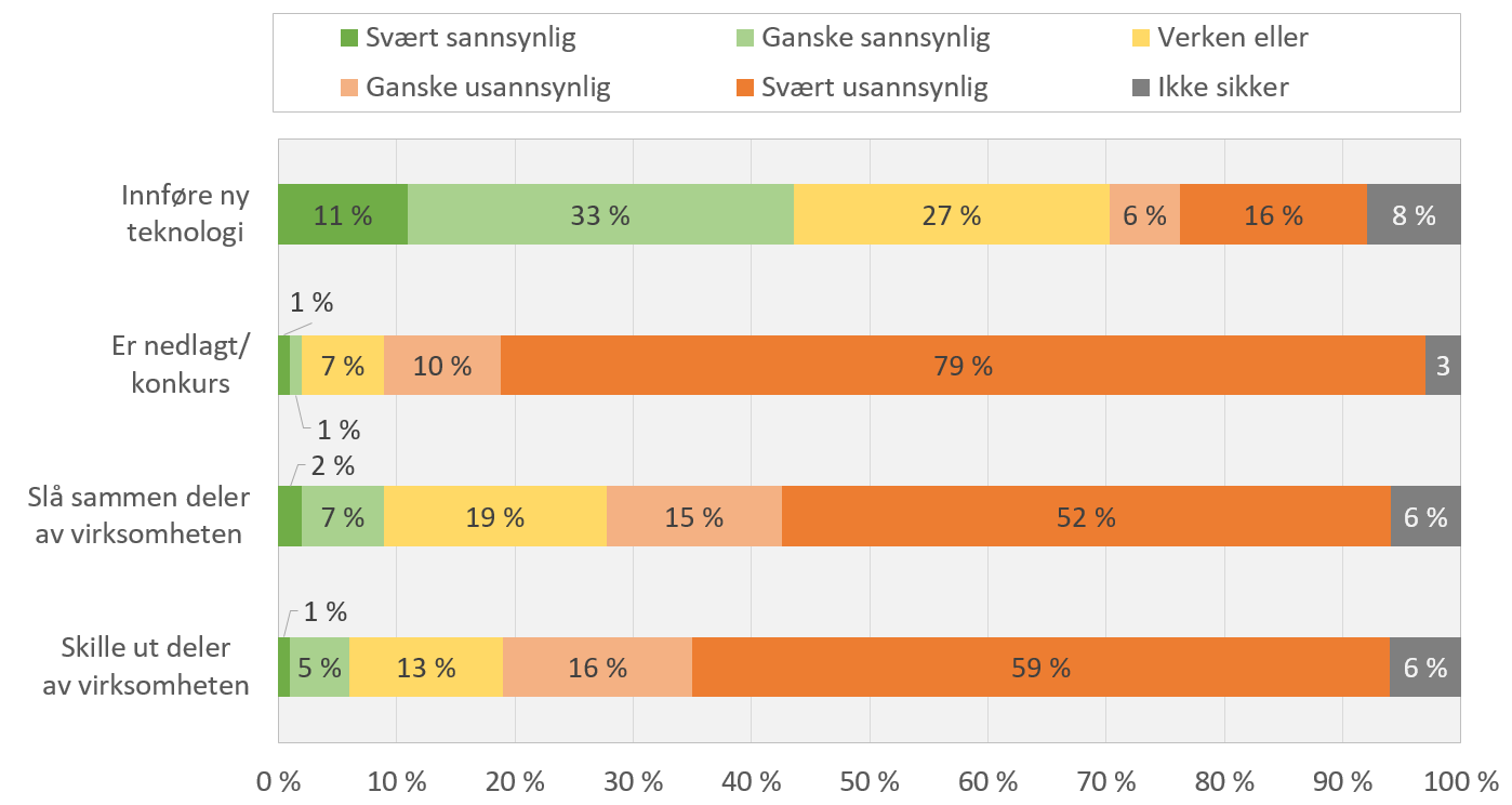 Når det gjelder å skille ut deler av virksomheten, er det totalt 6 prosent som mener dette er sannsynlig. Her er det ingen signifikante forskjeller mellom sektorene.