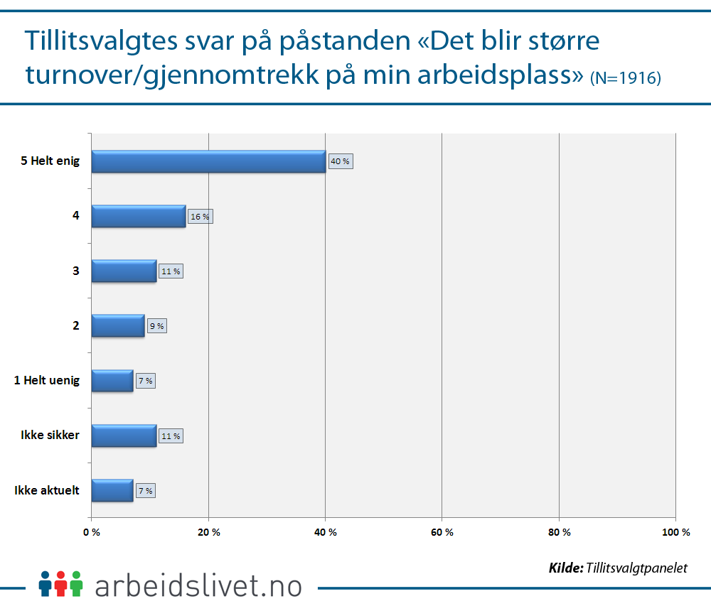 Blant de tillitsvalgte ute på arbeidsplassene er det bekymring for konsekvensene. Mer enn halvparten mener at en slik endring vil føre til større gjennomtrekk på arbeidsplassen, færre fast ansatte og dårligere arbeidsmiljø.