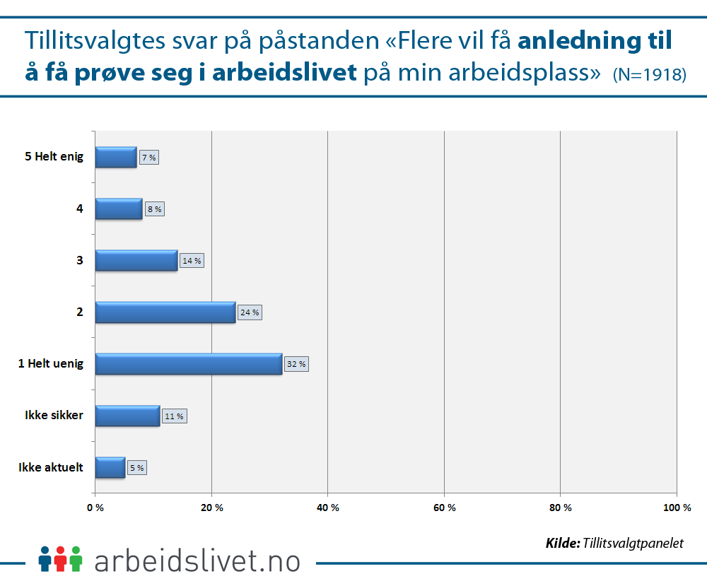 Tillitsvalgtes svar på påstanden «Flere vil få anledning til å få prøve seg i arbeidslivet på min arbeidsplass»