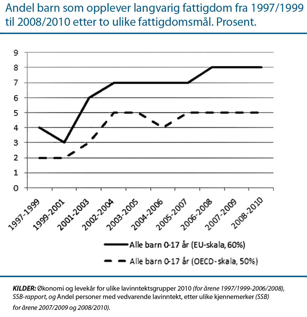ANDEL BARN som opplever langvarig fattigdom fra 1997/99 til 2008/10 etter to ulike fattigdomsmål. (Klikk for full størrelse. |
