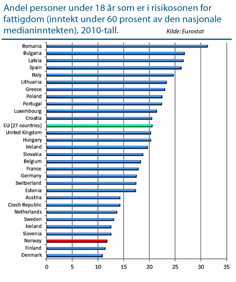 | ANDEL personer under 18 år i risikosonen for fattigdom (inntekt under 60 av nasjonal medianinntekt). 2011. Kilde: Eurostats nettside. (Klikk for full størrelse.) |